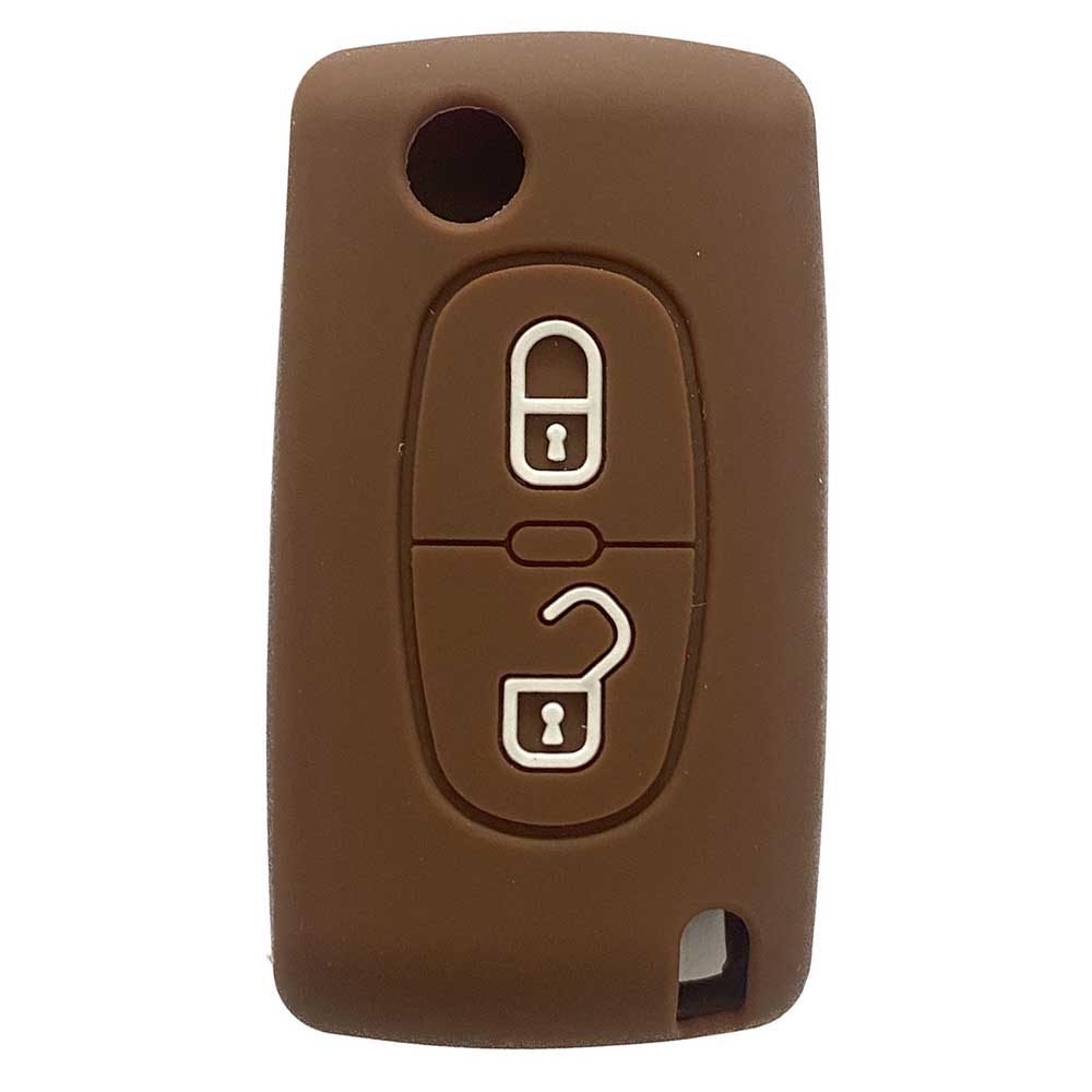 Husă de silicon Peugeot cu 2 butoane, maro. Husa este tăiată precis, se potrivește perfect, urmând forma cheii și oferă protecție împotriva posibilelor daune. Cheia nu se mișcă și nu zornăie în husa de silicon.